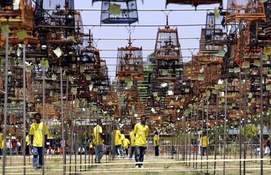 Thai Muslim villagers look at birds in cages during in a bird-singing contest in Yala province, about 1,100 km (683 miles) south of Bangkok March 7, 2010. About 6,000 birds took part in the competition. (Reuters)